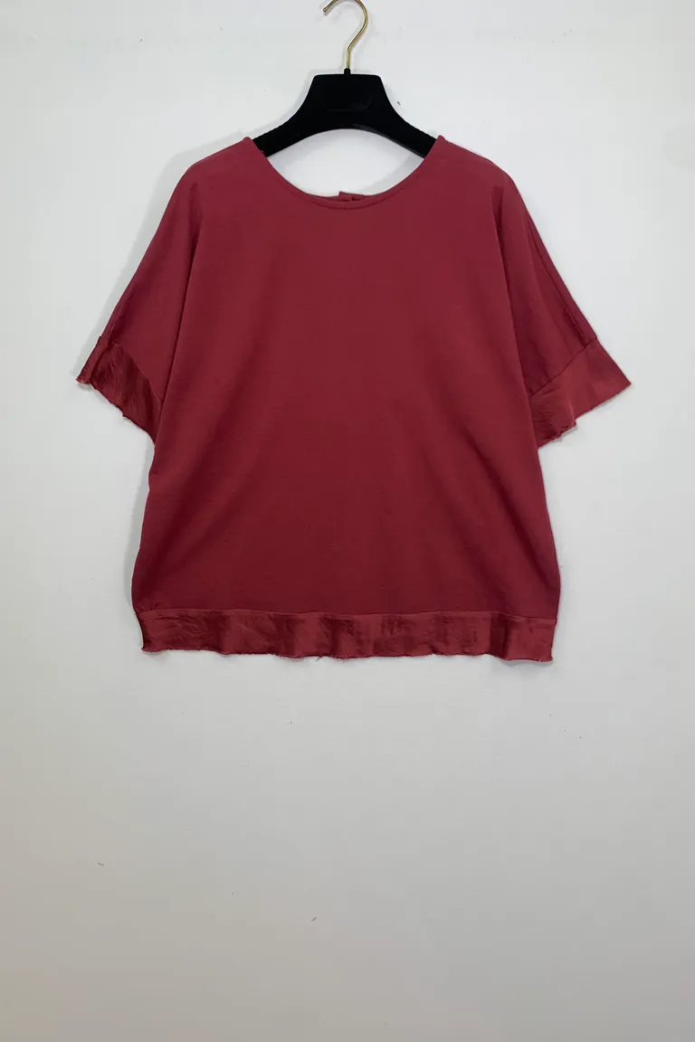 Description Maglietta mezza manica con profili in raso sfrangiato, bottoni lungo la schiena