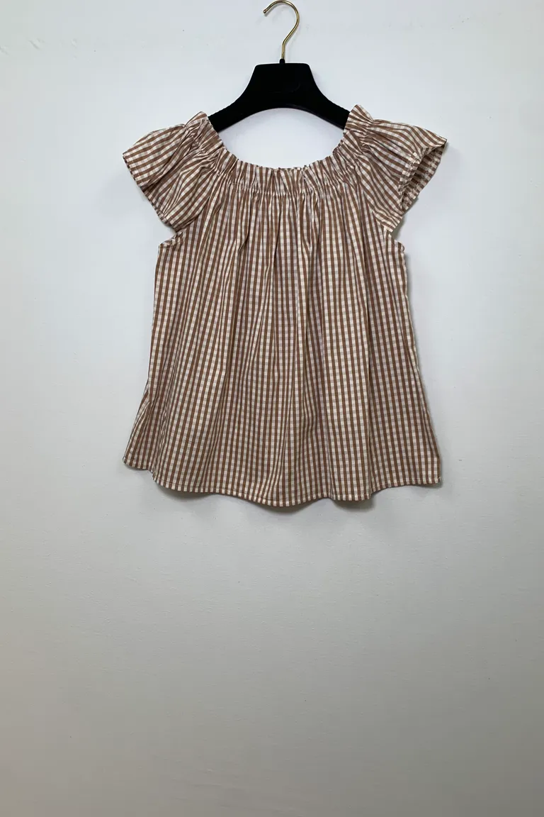 Description Maglietta a quadri con scollo a barchetta arricciato