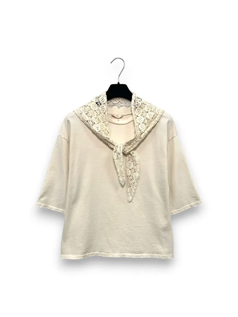 Description Maglietta mezza manica con foulard all’uncinetto in tinta
