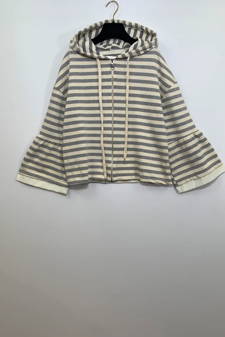 Description Felpa rigata con zip, cappuccio e maniche a campana