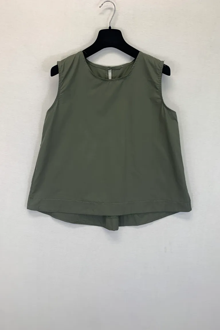 Description Canotta svasata più lunga dietro, con bottone dietro il collo