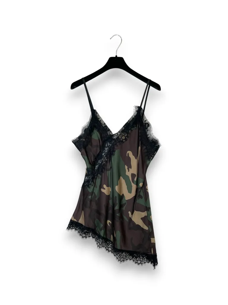 Description Canotta asimmetrica in viscosa mimetico con inserti in pizzo
