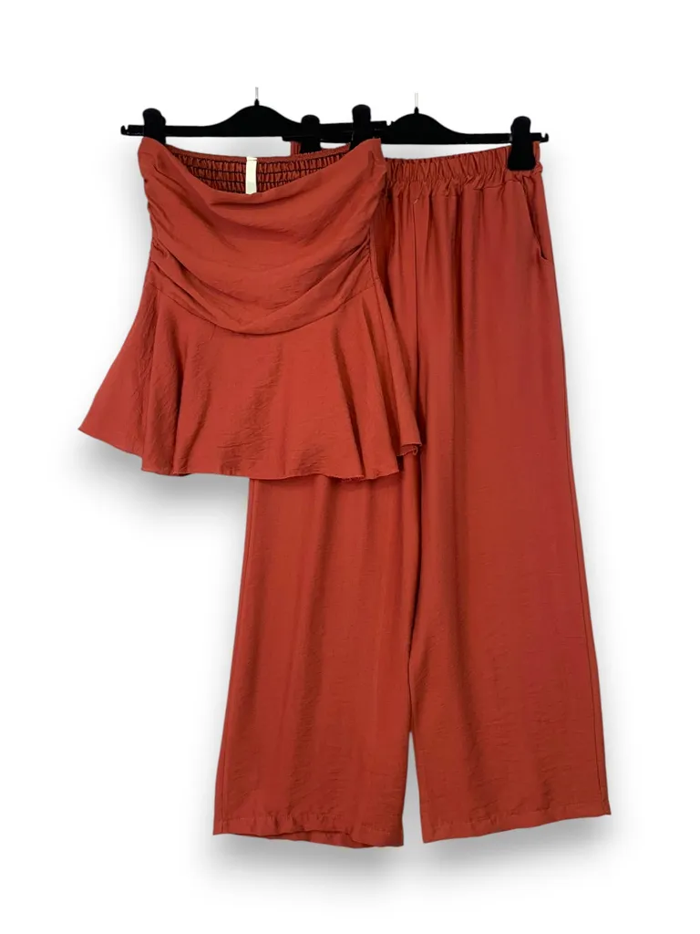 Description Completo top a fascia con corpetto dietro e pantalone a palazzo