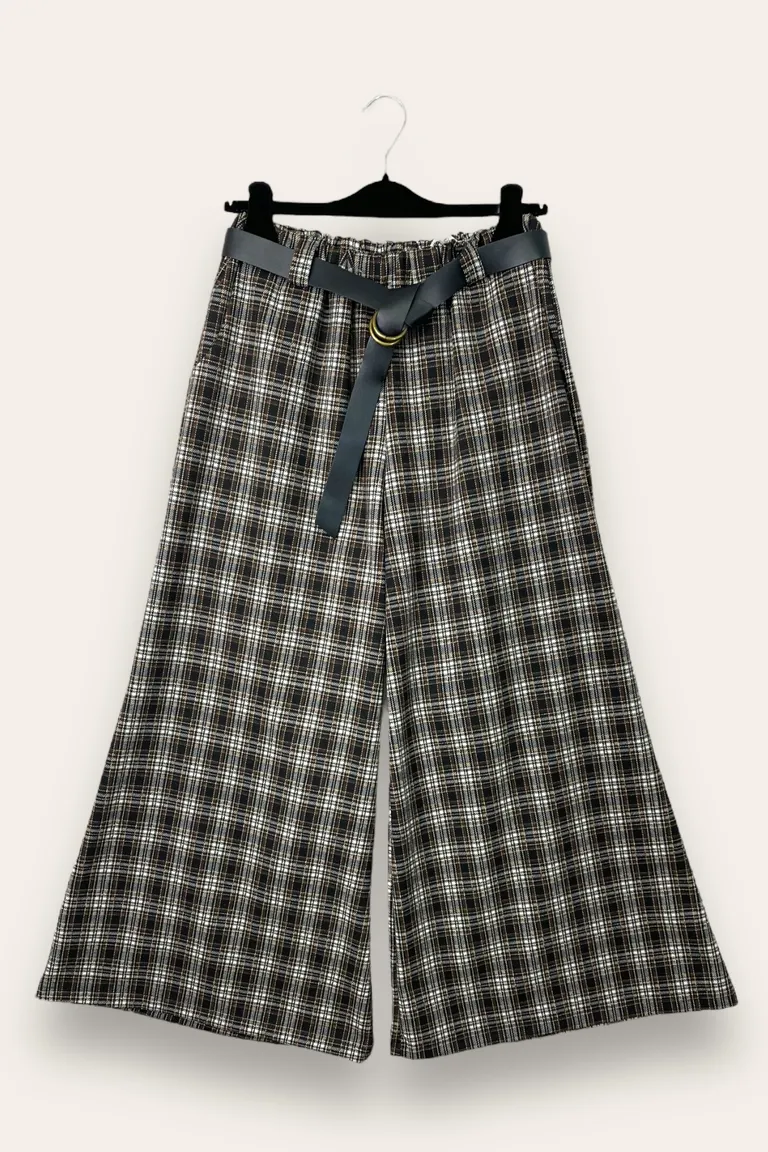 Description Pantalone a gamba larga a quadri, con elastico in vita