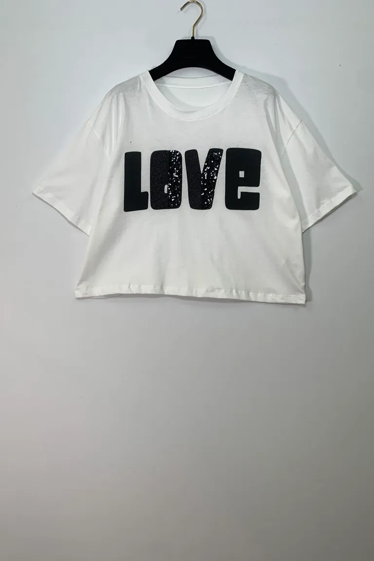 T-shirt corta con stampa love a paillettes