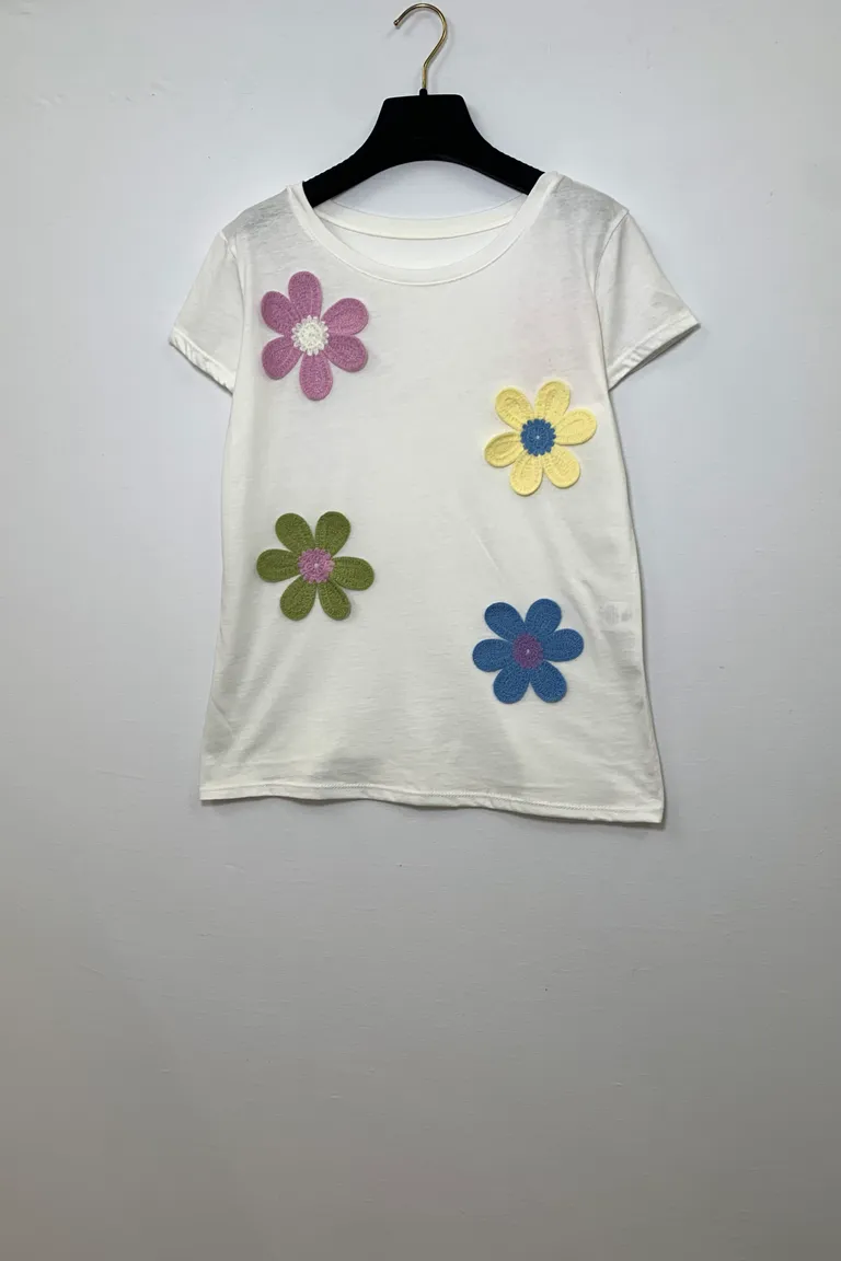 T-shirt con fiori grandi all’uncinetto