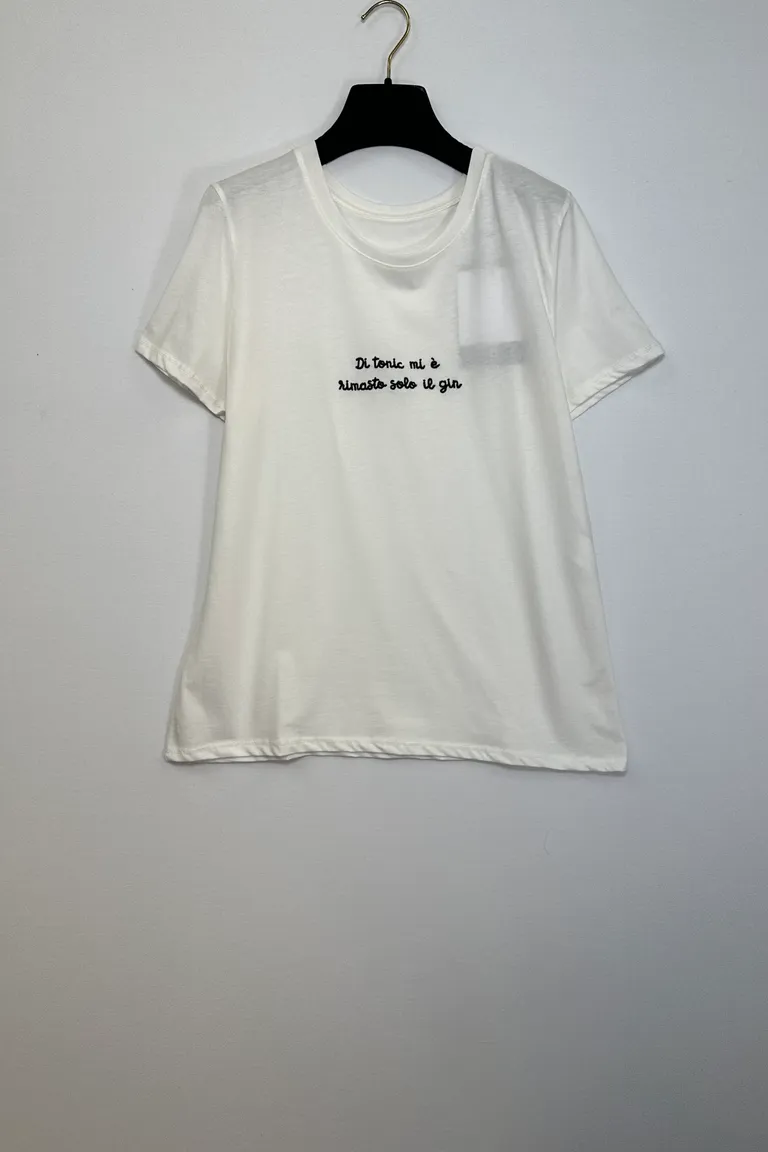 Description T-shirt con ricamo “di tonic mi è rimasto solo il gin”
