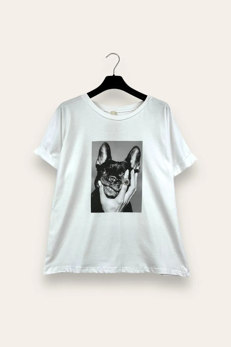 T-shirt stampa bulldog con una mano